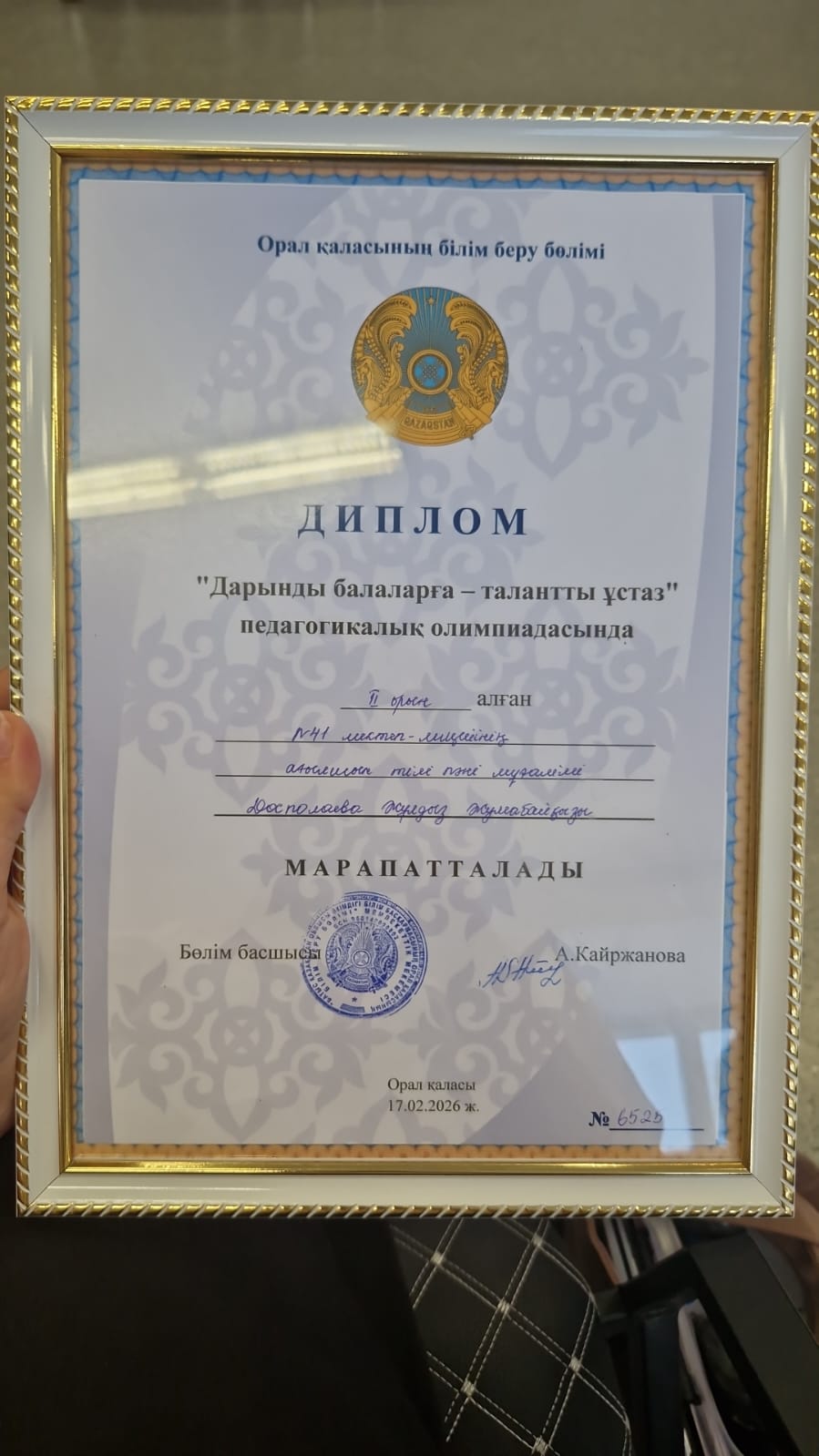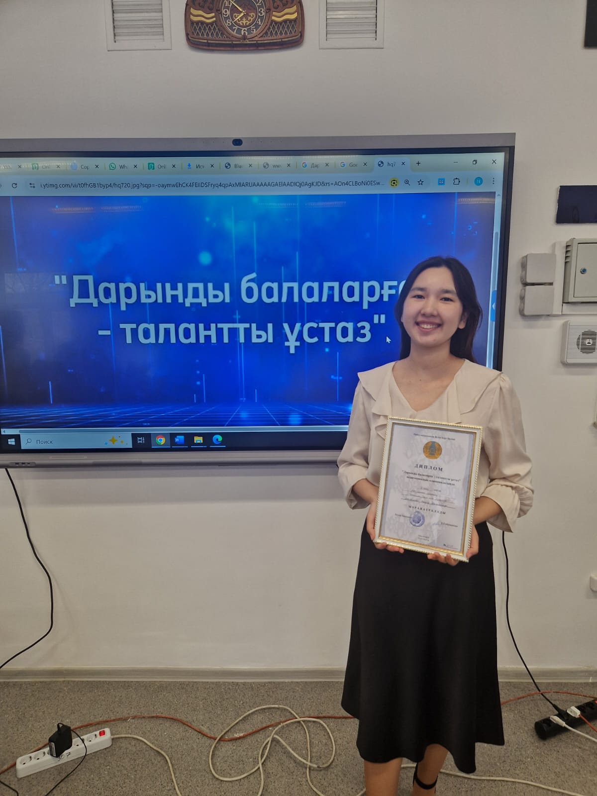 Жас педагогтердің шығармашылық әлеуетін арттыру, олардың кәсіби шеберлігін шыңдау және өзін-өзі дамытуына қолайлы орта қалыптастыру – бүгінгі білім беру жүйесінің басты міндеттерінің бірі. Осы мақсатта ұйымдастырылған «Дарынды балаларға – талантты ұстаз» атты педагогикалық олимпиада жас мамандардың жаңашыл идеяларын қолдап, олардың кәсіби көзқарасын қалыптастыруға, тәжірибе алмасуына және білім беру үдерісін жетілдіруге бағытталды. Мектебімізден байқауға қатысқан ағылшын тілі пәні мұғалімі Досполаева Жұлдыз Жұмабайқызы жоғары дайындық деңгейін, жаңашыл көзқарасын және шығармашылық ізденісін таныта отырып, жүлделі ІІ орынды иеленді. Әріптесімізді айтулы жетістігімен шын жүректен құттықтаймыз! Алдағы уақытта да шығармашылық табыс, кәсіби биіктер мен толағай жетістіктер тілейміз. Мектебіміздің абыройын асқақтата беріңіз!