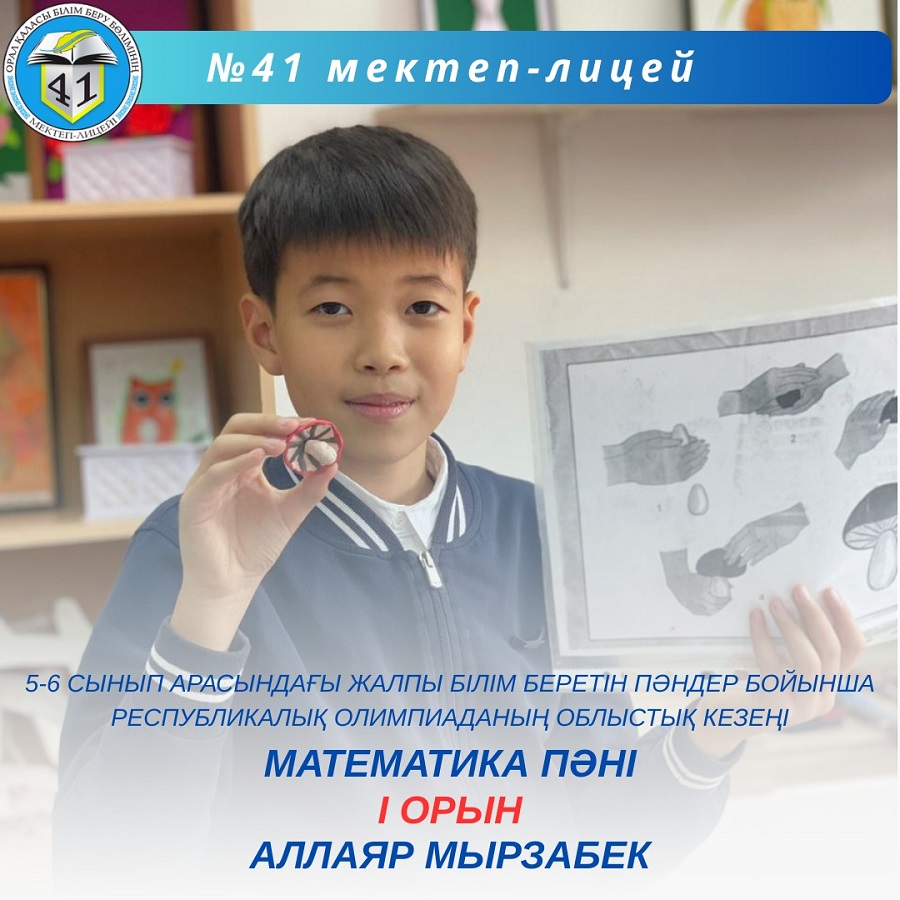 Жалпы білім беретін пәндер бойынша Республикалық олимпиаданың облыстық кезеңінде математика пәнінен 5-сынып оқушысы Аллаяр Мырзабек жүлделі I орын иеленді.
